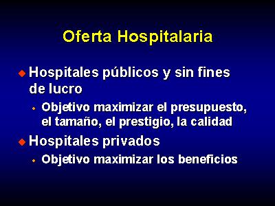 En el caso de la oferta hospitalaria, los hospitales publicos y los hospitales privados sin fines de lucro tienen como objetivo maximizar el presupuesto, el tamano, el prestigio o la calidad prestada.
