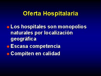 Los hospitales son monopolios naturales por localización geográfica, por ello existe una escasa competencia entre hospitales. La competencia suele basarse en una mayor calidad y no un menor precio.