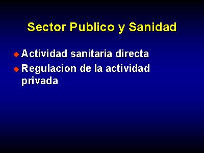 El sector público actúa en la sanidad mediante una actividad sanitaria directa y mediante la regulacion de la actividad privada.