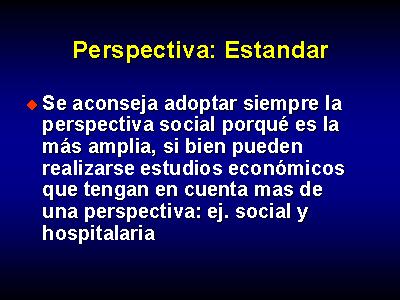 Se aconseja adoptar siempre la perspectiva social porqué es la más amplia, si bien pueden realizarse estudios económicos que tengan en cuenta mas de una perspectiva: ej. social y hospitalaria.