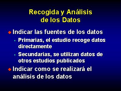 El estudio debe indicar las fuentes de los datos. Diferenciando si las fuentes son primarias, el estudio recoge datos directamente; o si son secundarias, se utilizan datos de otros estudios publicados.
